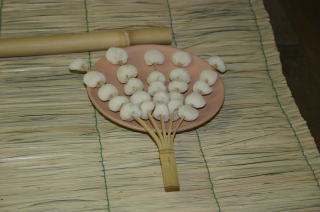 もともとは小さい団子を竹串の先にひとつ、少し間を置いて4つ続けて刺した串が扇形に10本並び、団子が50個ついていたそうです。